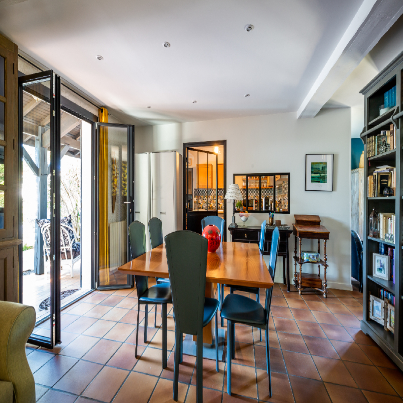 Une terrasse avec abri pour les déjeuners face à la piscine, une cave, buanderie, cellier et garage.
