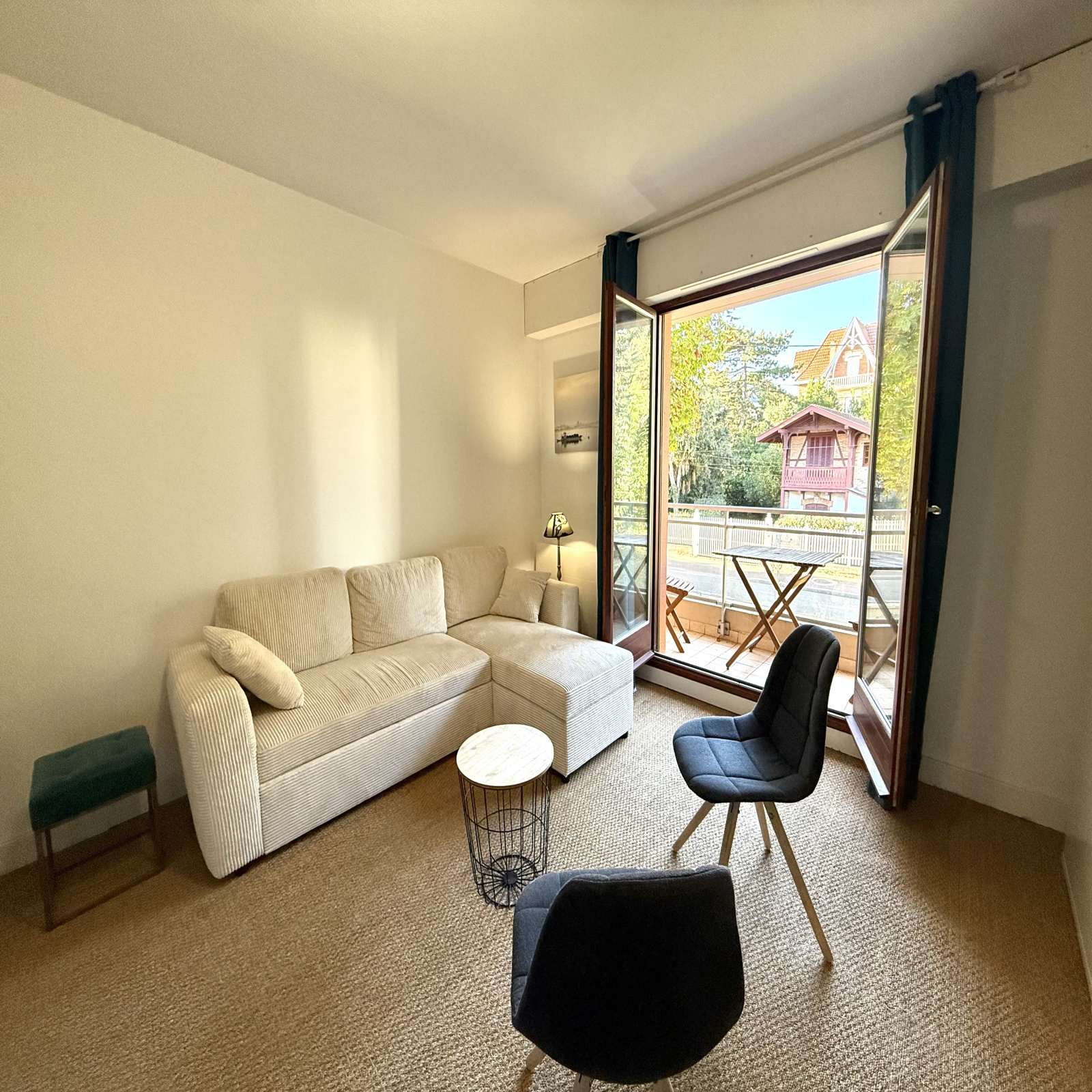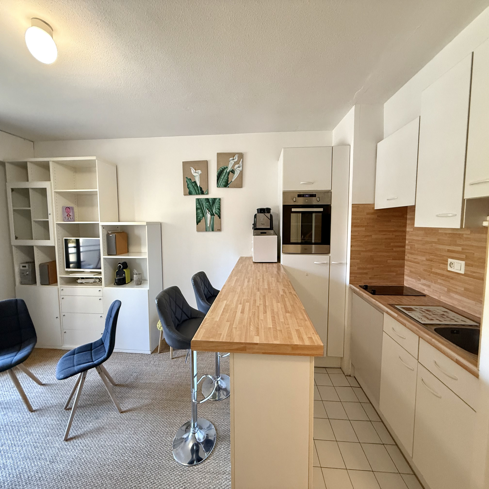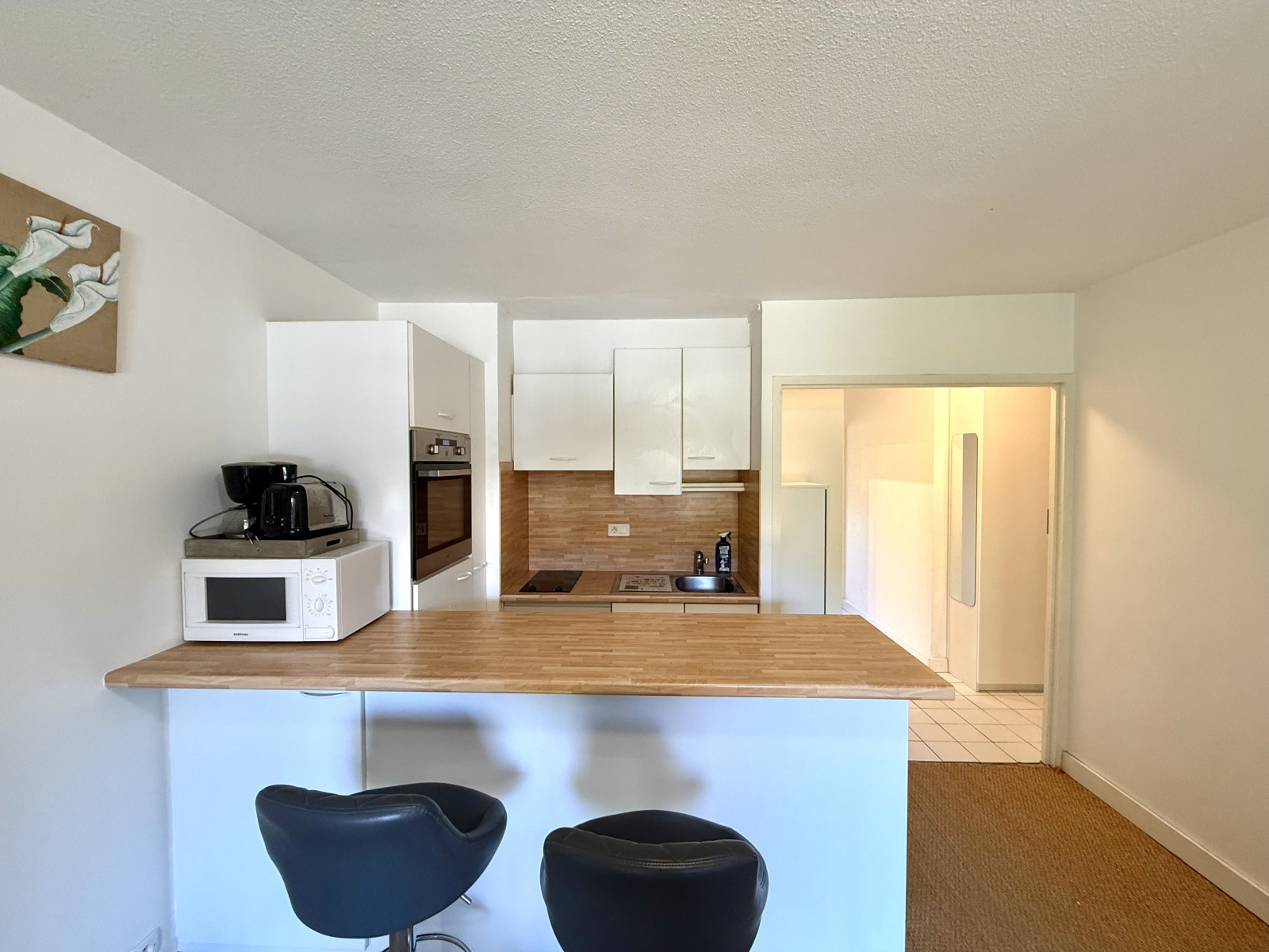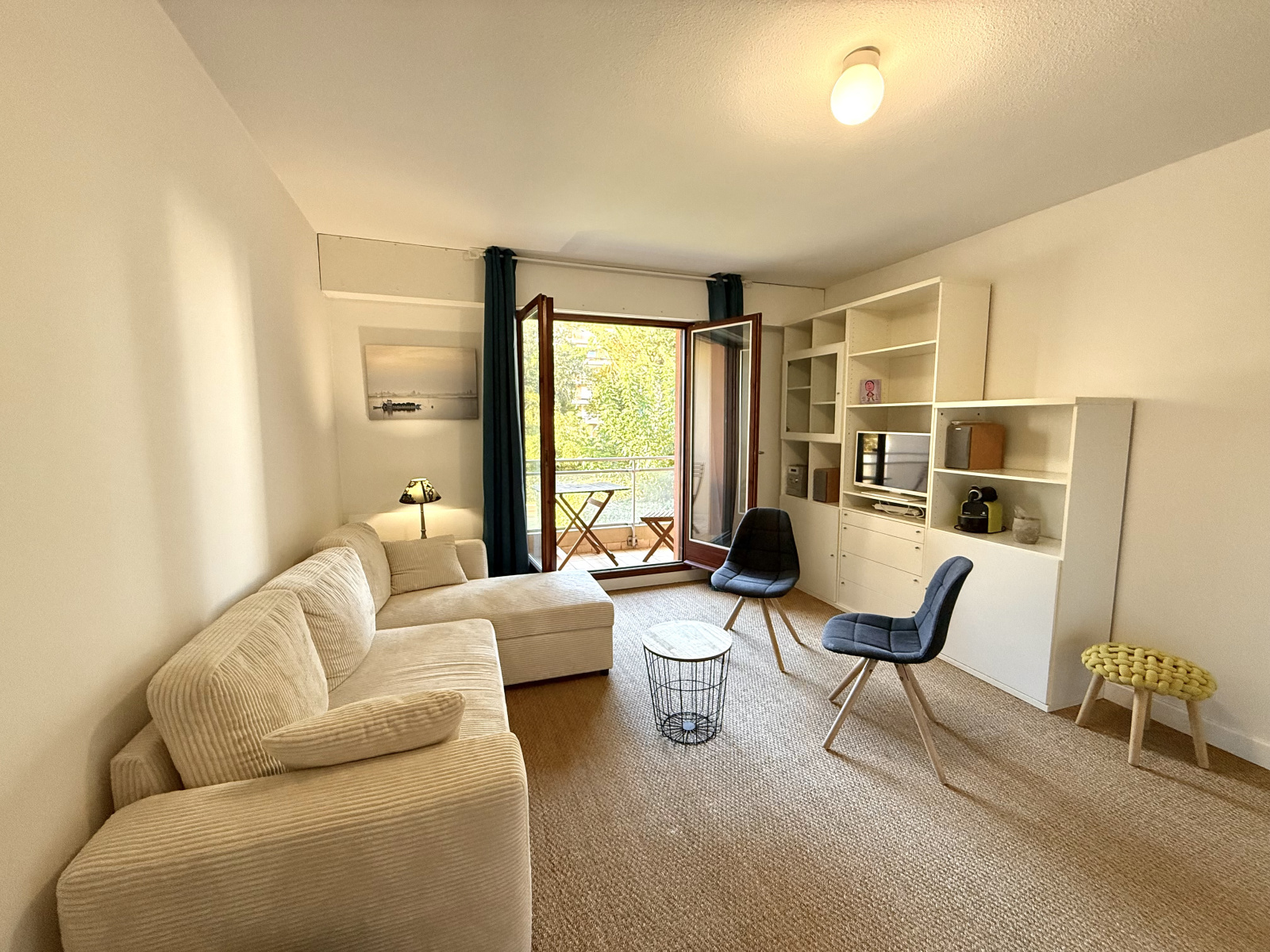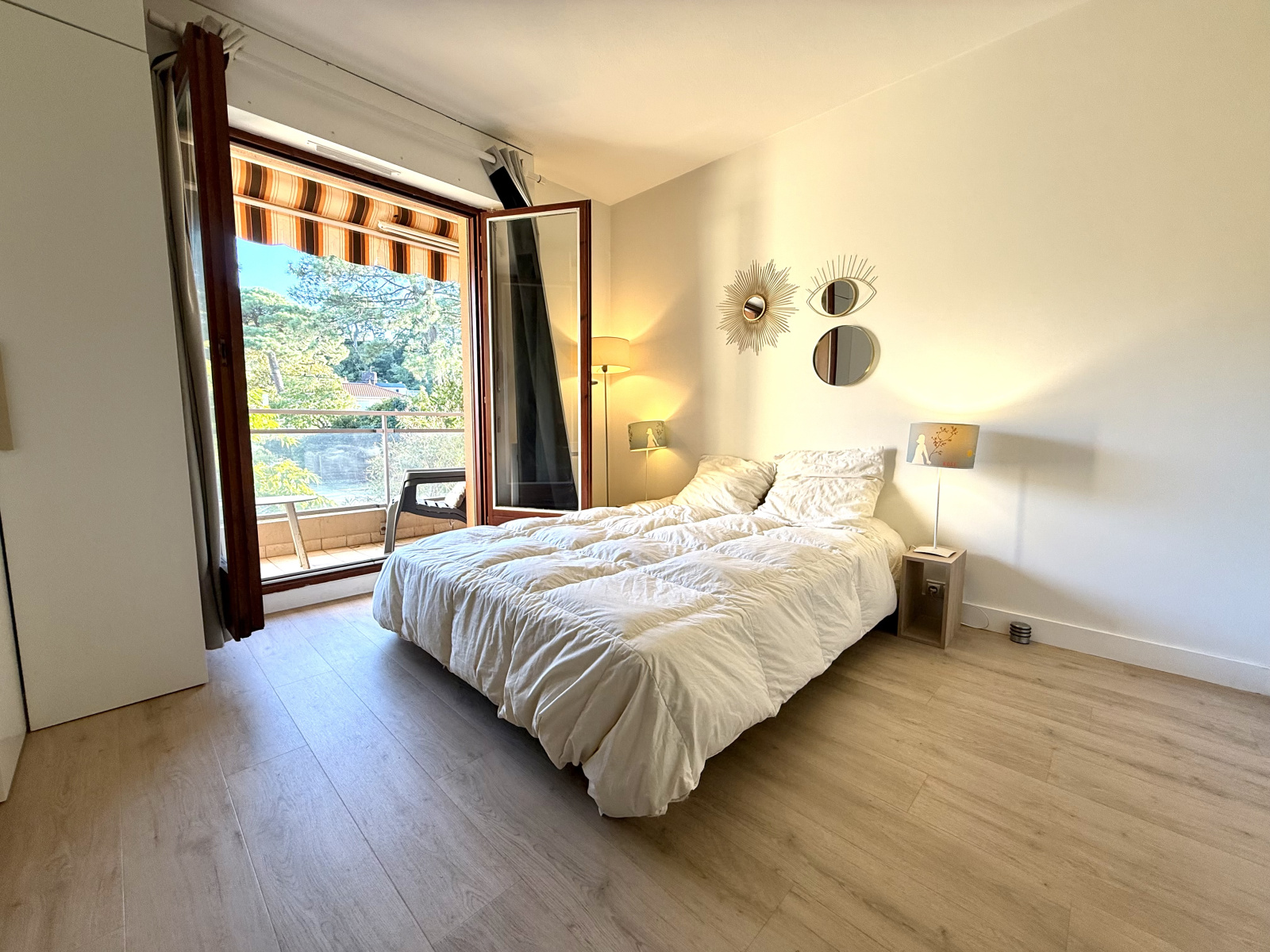 Dès l’entrée, on découvre une belle pièce de vie baignée de lumière grâce à sa double exposition, offrant un espace salon convivial ouvert sur une cuisine fonctionnelle. Le séjour s’ouvre sur un premier balcon où l’on profite du calme environnant et de la douceur du climat arcachonnais. La chambre, spacieuse, dispose quant à elle de son propre balcon privatif, donnant sur une végétation apaisante qui renforce le sentiment d’intimité et de sérénité.