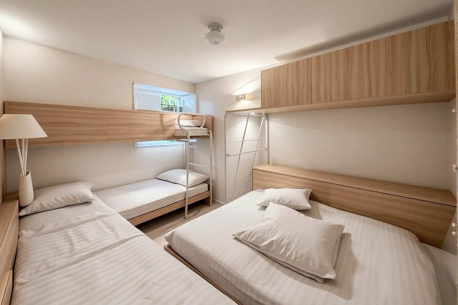 D’une surface de 48 m² Carrez, l’appartement se compose de deux chambres et d’une chambre cabine, accompagnées de deux salles d’eau et de deux WC, permettant d’accueillir confortablement famille et invités. La cuisine entièrement neuve, tout comme les salles d’eau récemment rénovées, apportent une touche contemporaine et soignée à l’ensemble.
