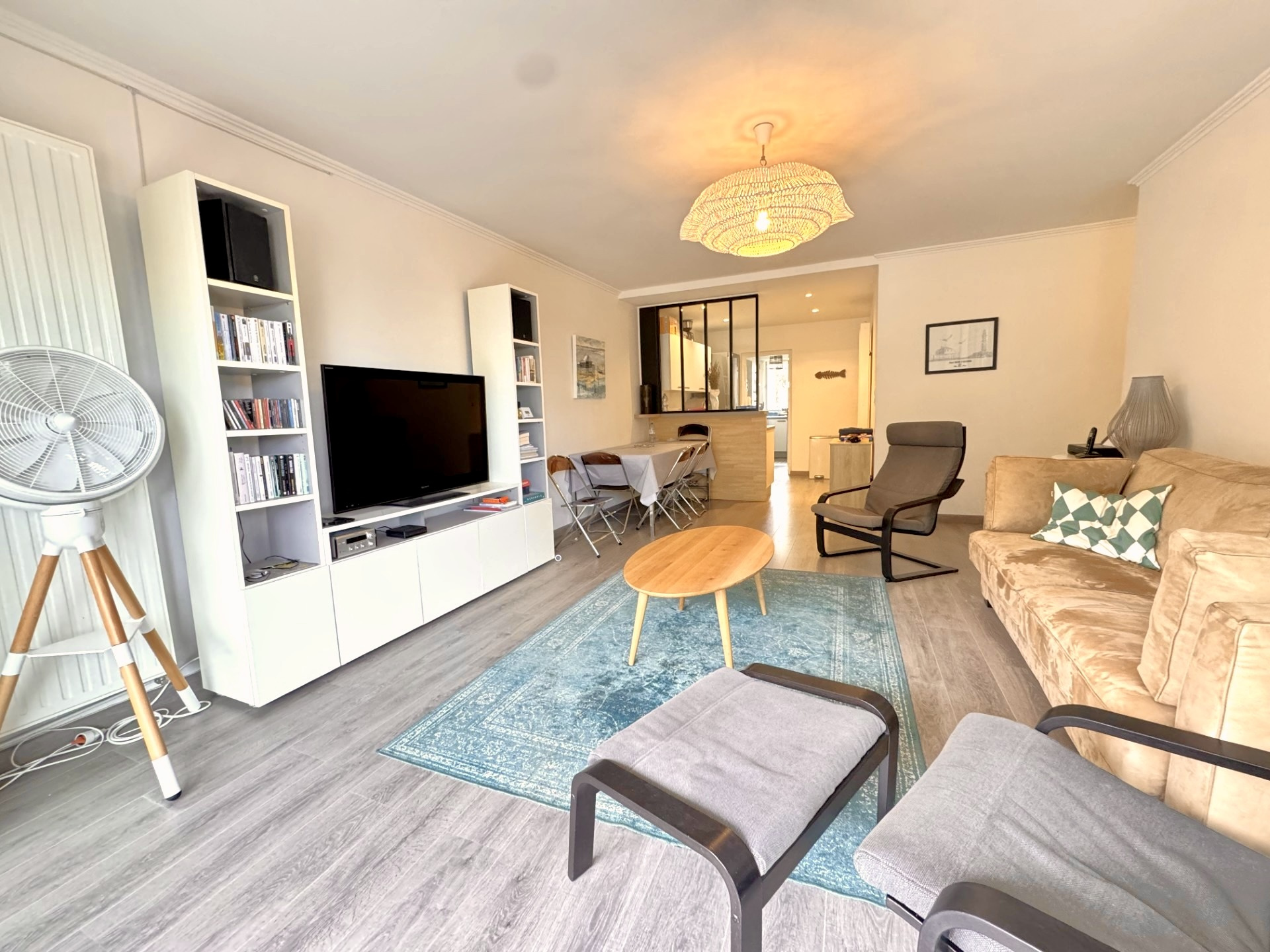Dès l’entrée, vous serez séduit par la distribution traversante de cet appartement baigné de lumière, offrant une vraie sensation d’espace et de confort. L’entrée avec placard dessert une pièce de vie spacieuse et agréable de plus de 30 m² avec cuisine américaine aménagée et équipée, prolongée par une terrasse où l’on profite d’un joli aperçu sur le bassin. L’espace nuit se compose de deux chambres confortables, d’une salle d’eau moderne et de WC indépendants.