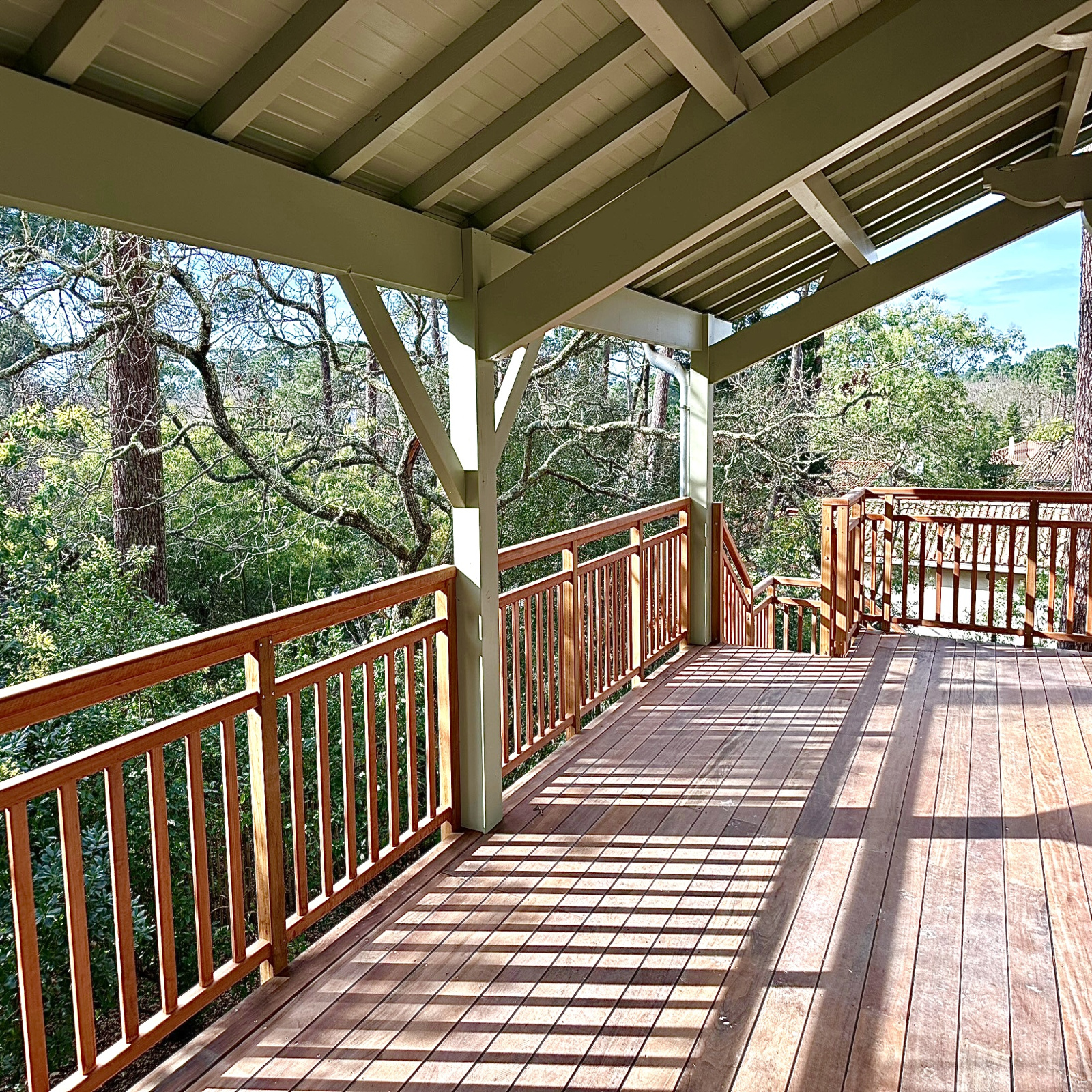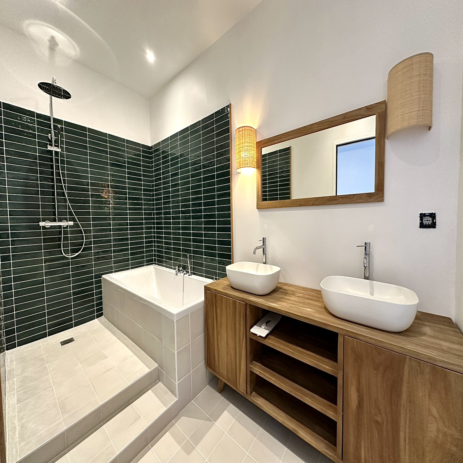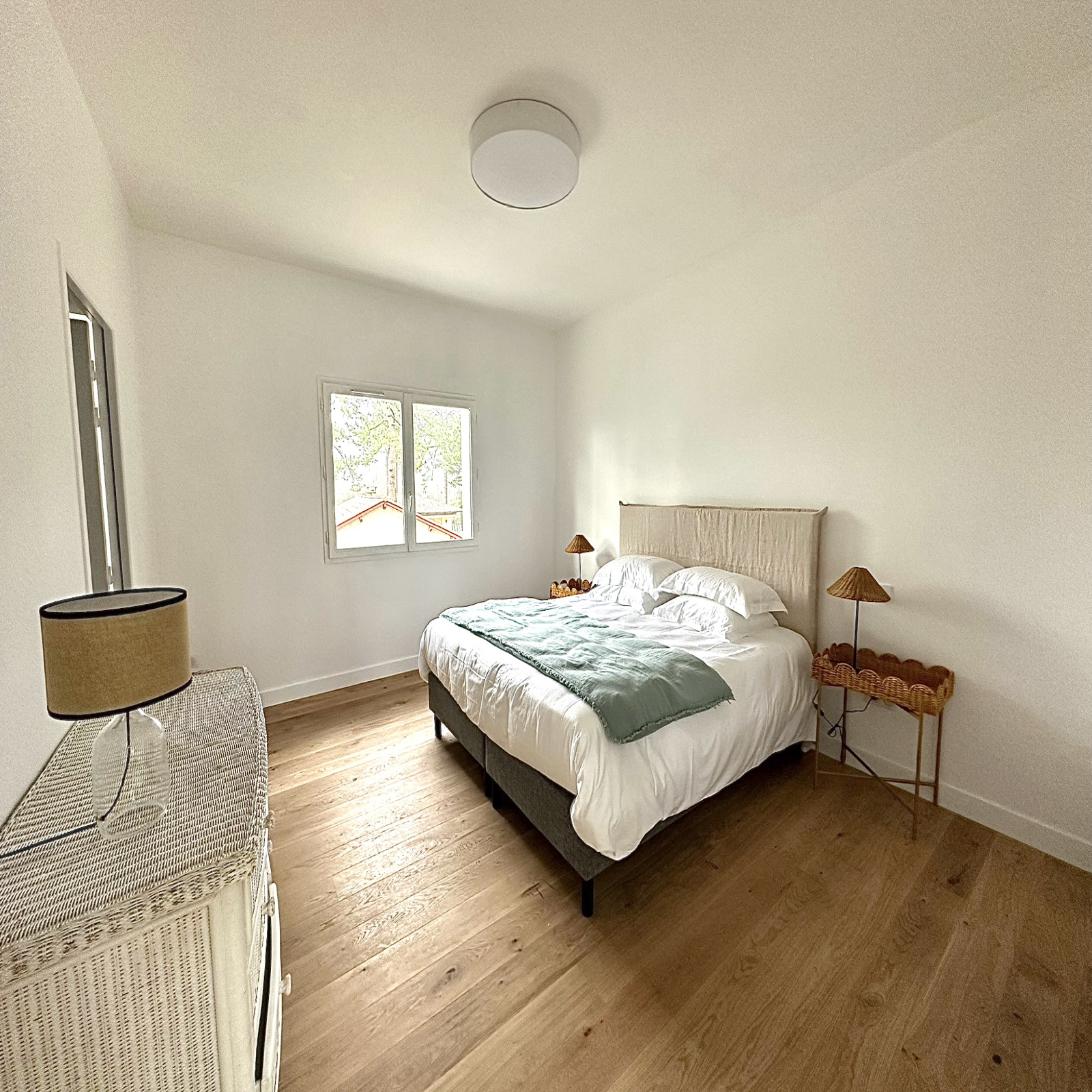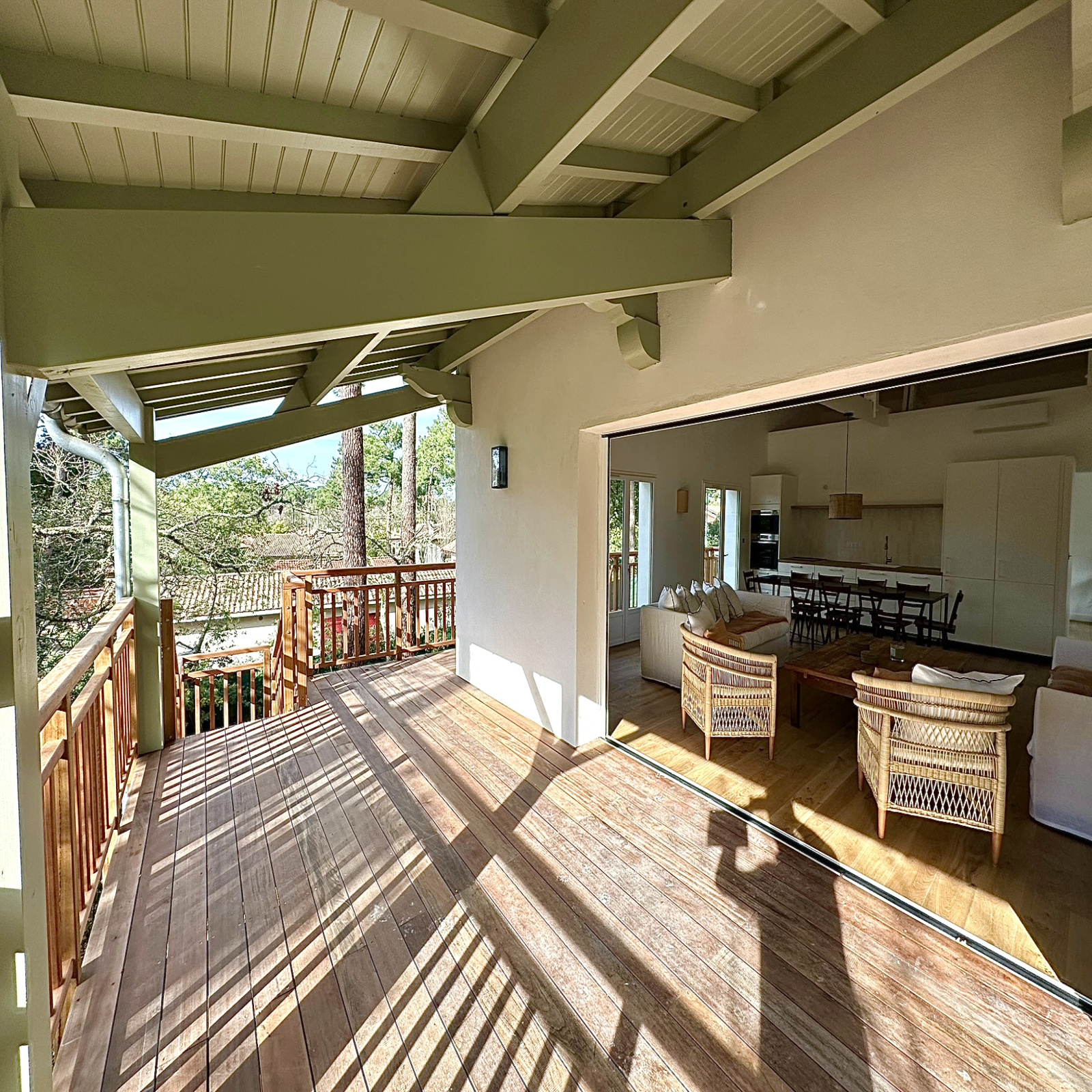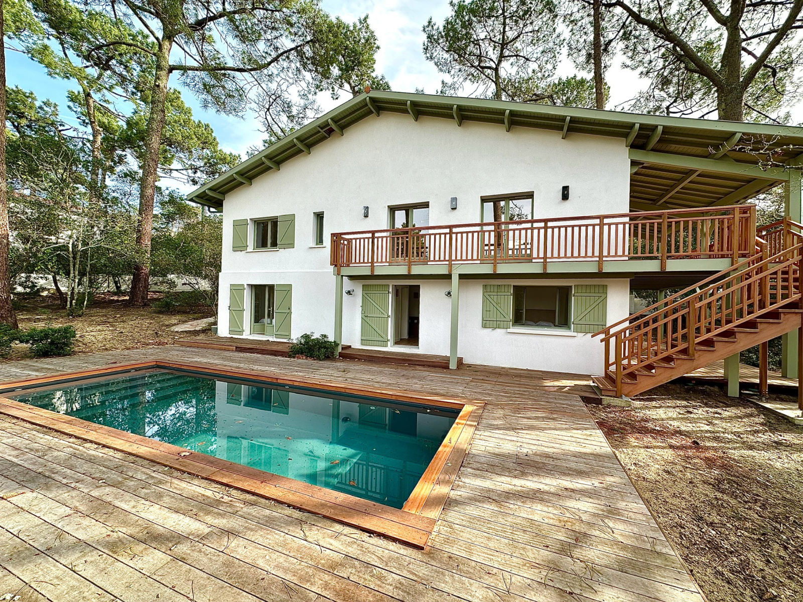 En hauteur et nichée sous les pins, cette villa typée basco landaise a été rénovée avec des prestations de qualité.