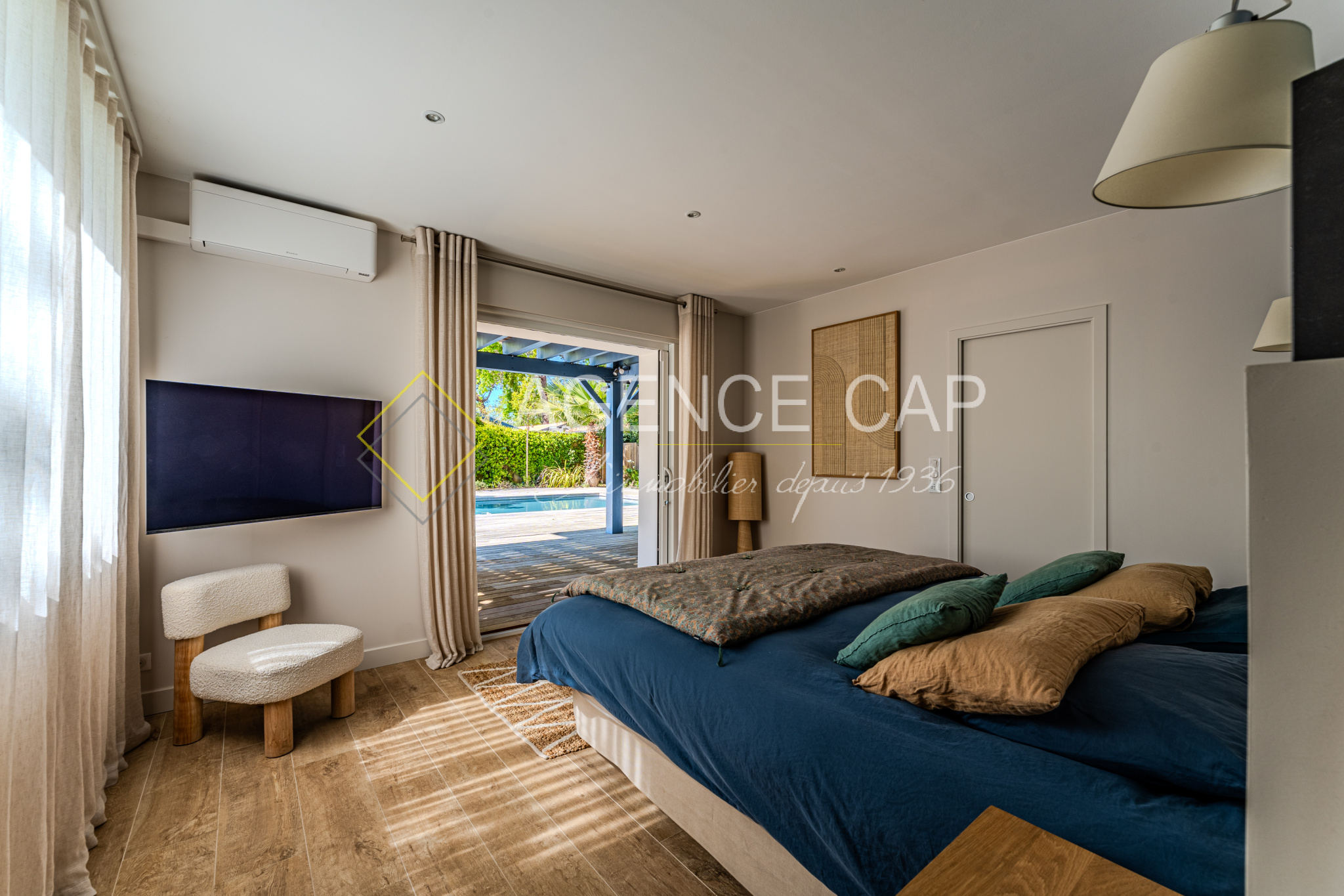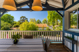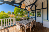 À l’extérieur, la terrasse couverte prolonge l’espace de vie vers un environnement verdoyant et intime. Pour les repas d’été, la cuisine extérieure prend naturellement le relais près de la piscine, véritable écrin de détente.