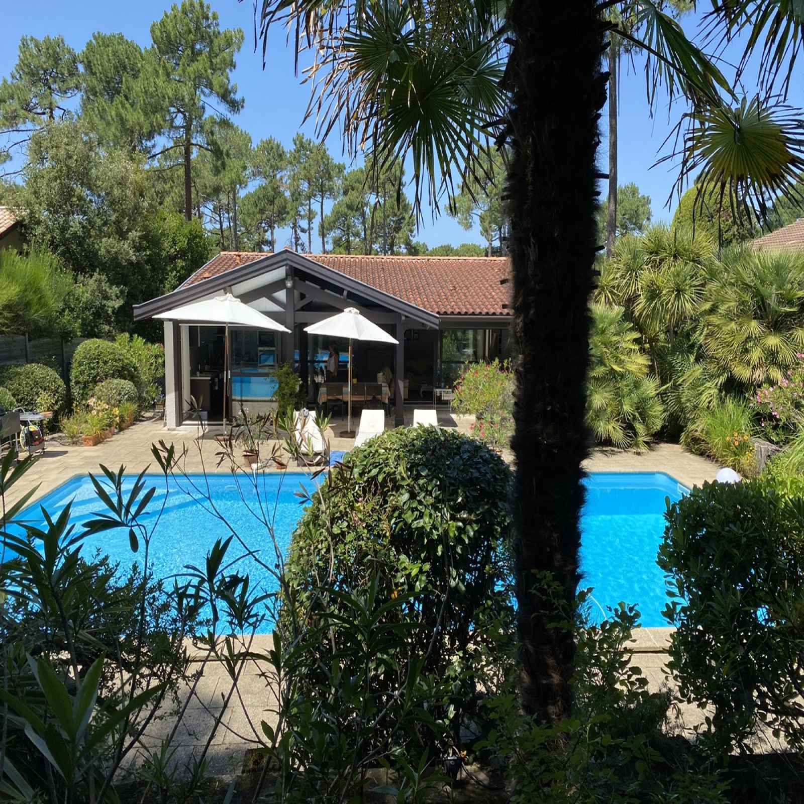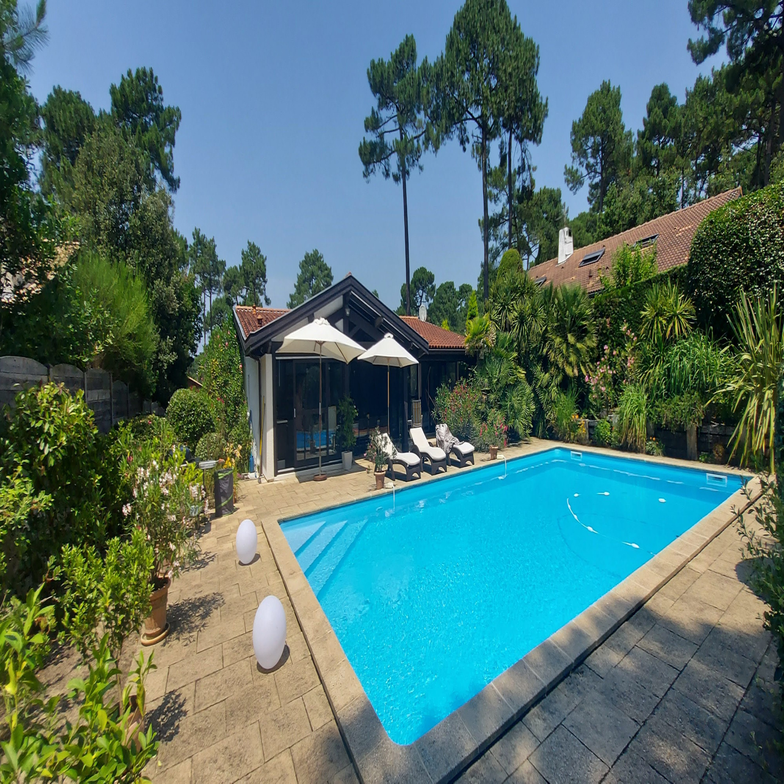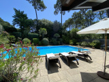 Une terrasse couverte, véritable pièce à vivre est tournée vers un agréable jardin paysagé agrémenté d'une piscine aux dimensions hors normes pour la région.