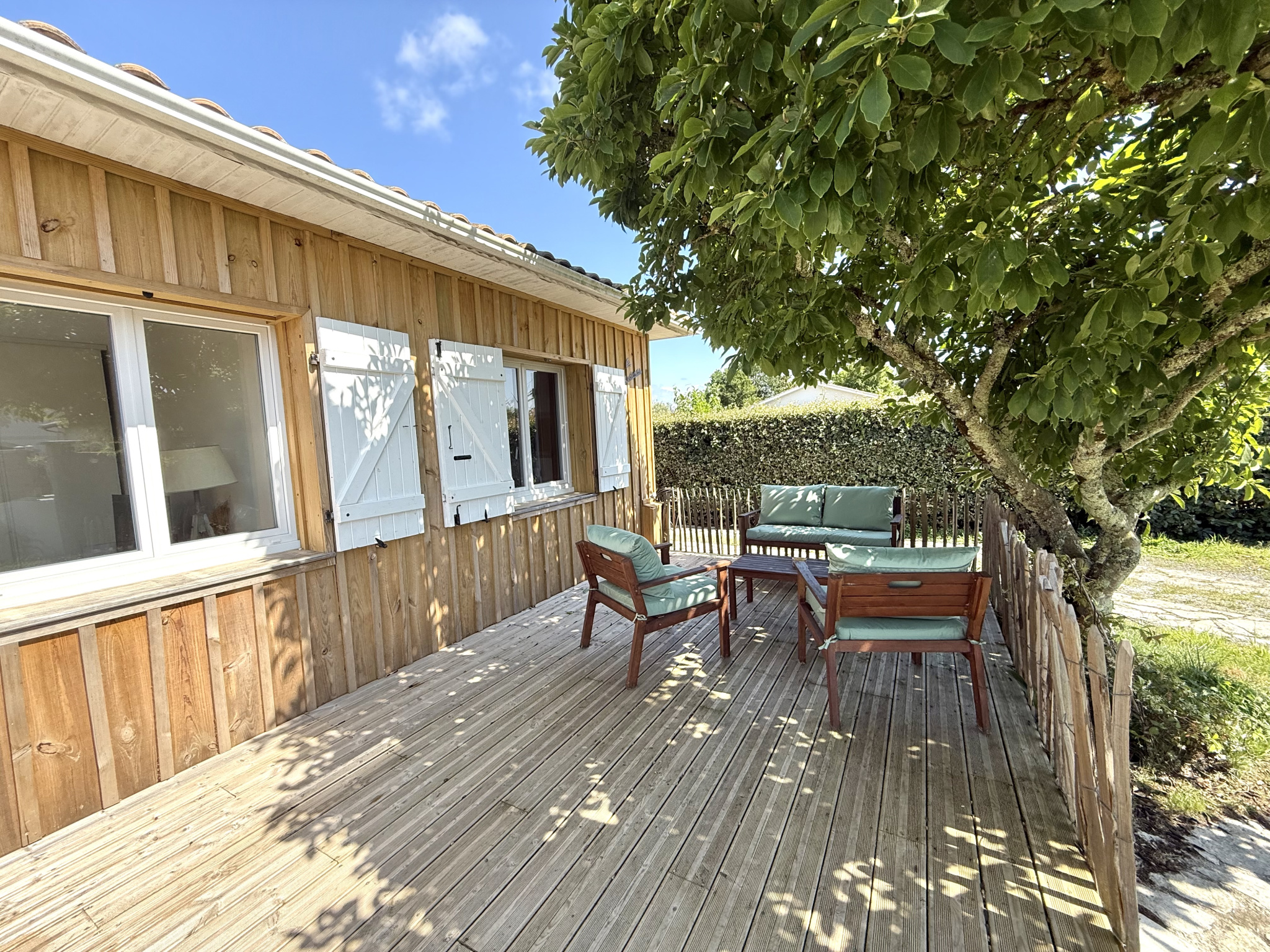 Le séjour, baigné de lumière naturelle, s’ouvre sur une terrasse exposée plein sud, idéale pour profiter des journées ensoleillées. La maison dispose également d’un agréable jardin sur un terrain de 400 m², avec d’un côté une zone arborée et de l’autre une terrasse parfaite pour les repas en extérieur.