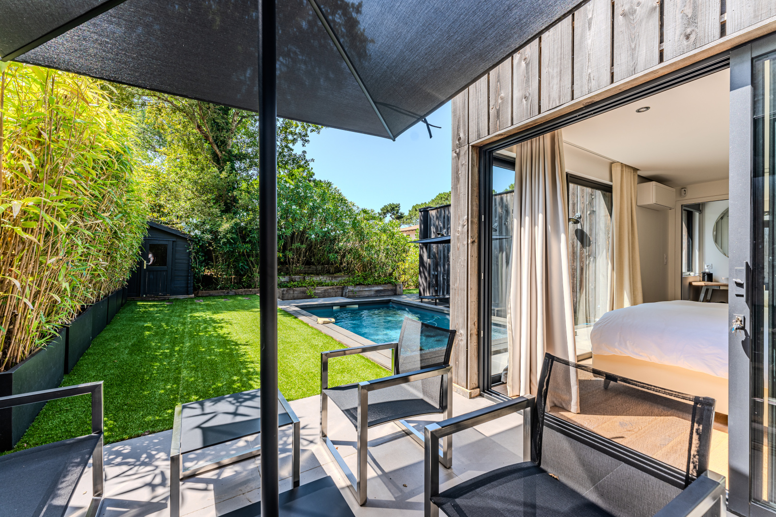 Située dans un coin calme, arboré et sans vis à vis du Pyla-sur-Mer, elle est à proximité des plages.
