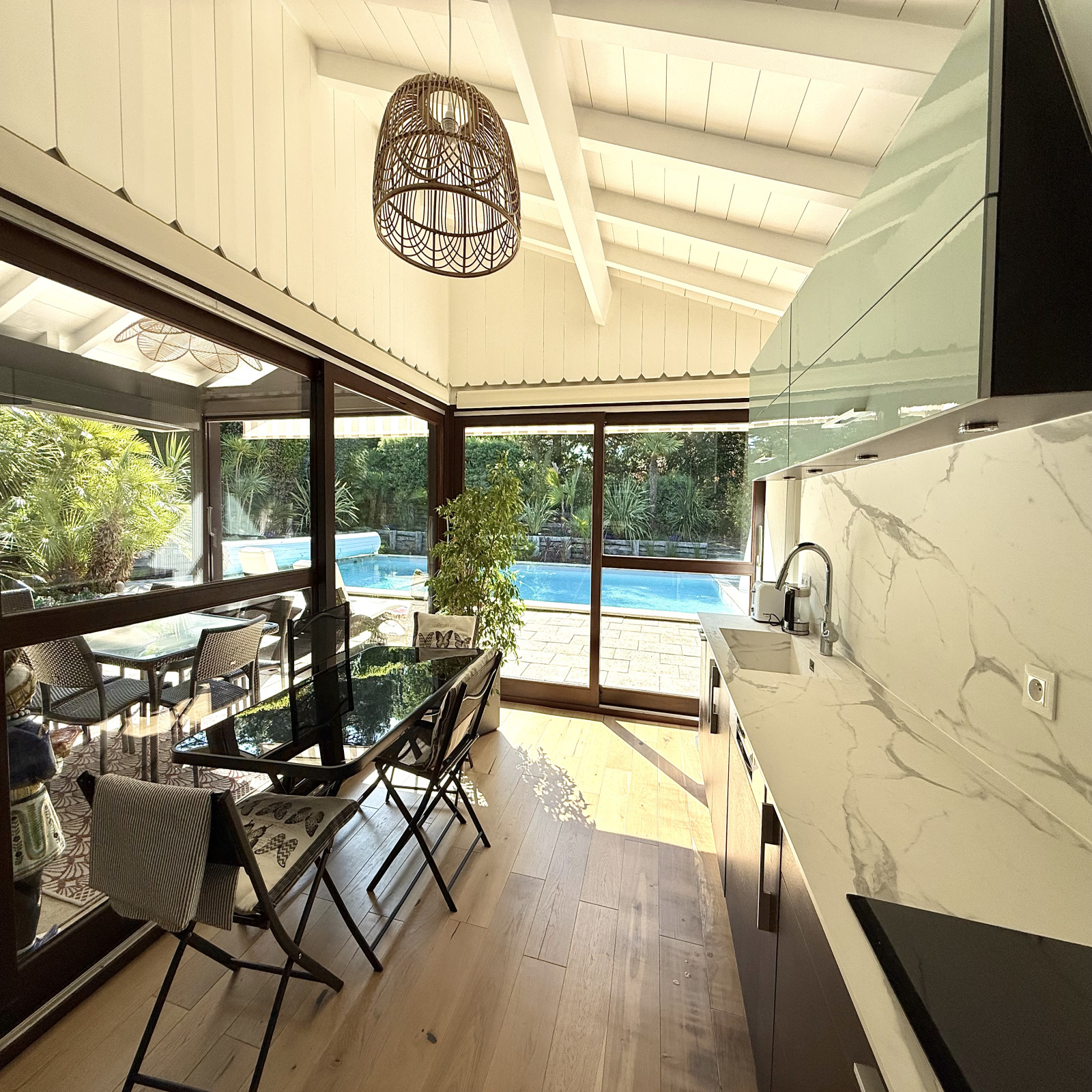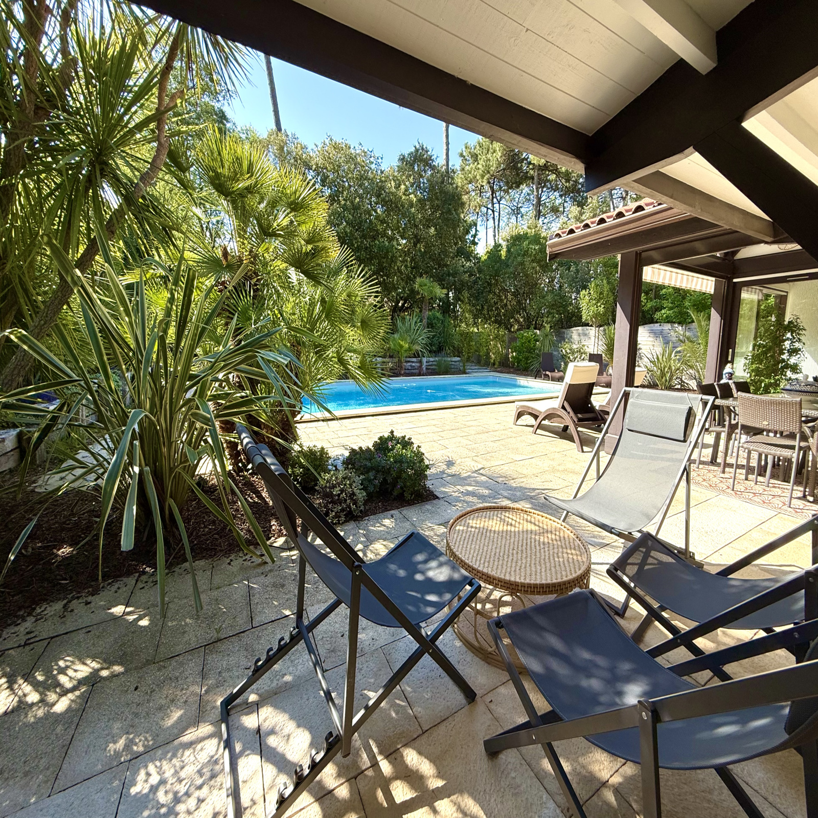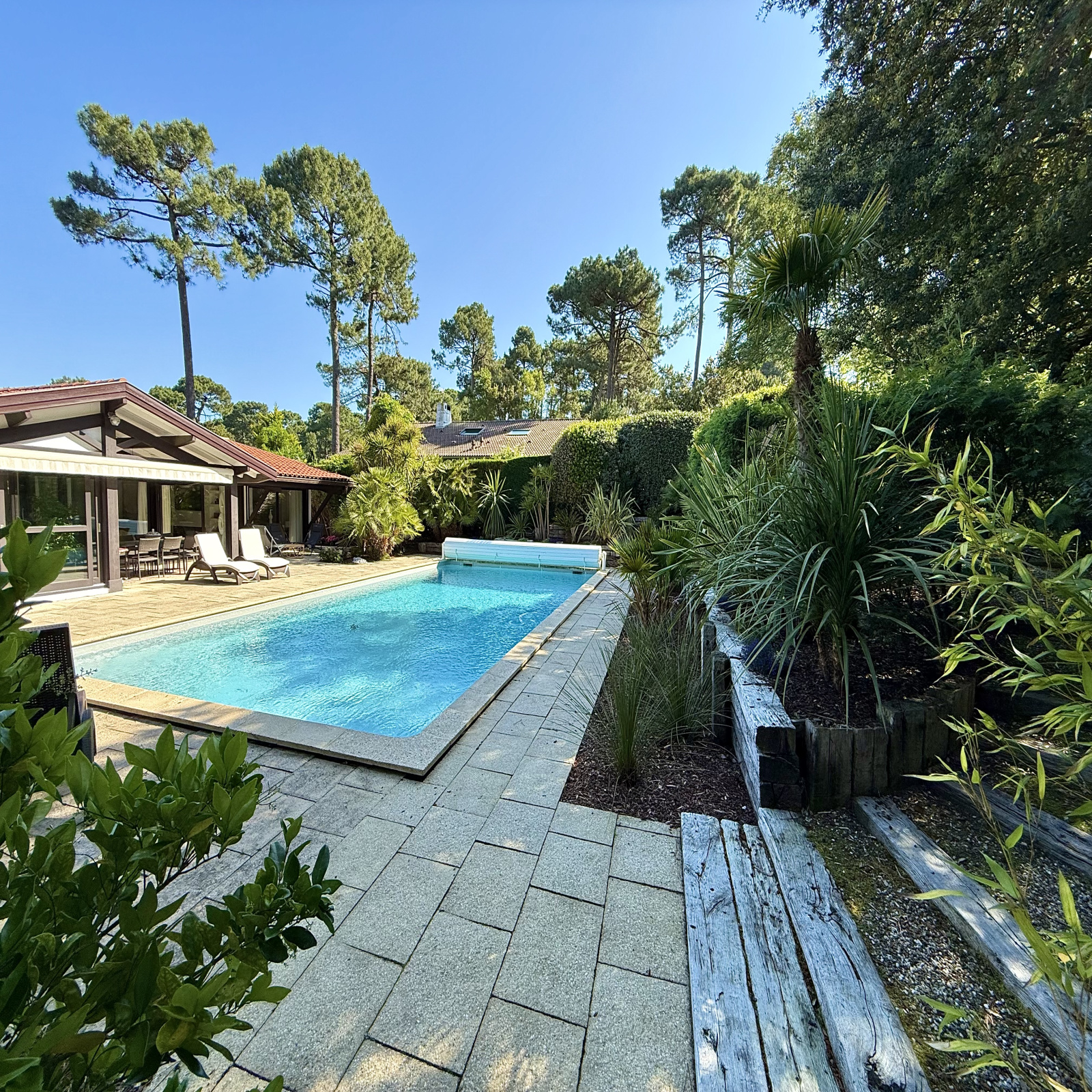 Ce terrain, paysagé et orienté plein sud, dispose d'une terrasse couverte idéale pour se détendre, et d'une superbe piscine également exposée plein sud. Vous pourrez profiter d'un cadre de vie calme et sans vis-à-vis, le tout à moins d'1 km du Moulleau.